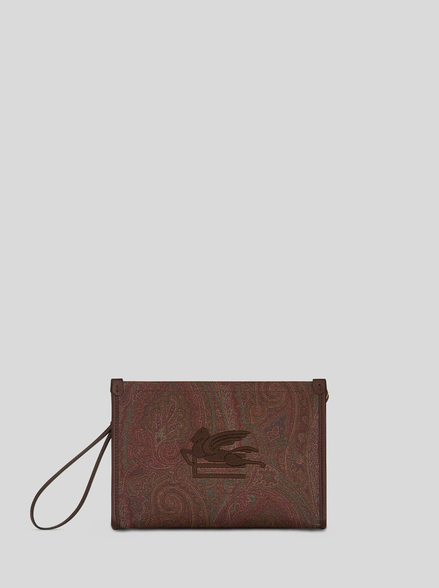Large pouch made from iconic Paisley jacquard fabric. This accessory is enhanced by the embroidered ETRO logo and Pegaso symbol on the front. The inner lining features a striped pattern. • Size: 7.87 x 11.81 x 1.97 inches (20 x 30 x 5 cm) • Zip closure • Detachable wrist strap • Internal patch pocket • Logo-branded inner label • Striped fabric lining • Made in Italy PRODUCT DETAILS • Exterior: Paisley jacquard cotton fabric coated with matt texture and lined with canvas • Detailing: 100% calfskin • Interior: 100% polyester • Coating: 100% PVC