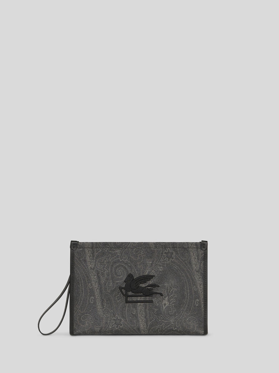 Large pouch made from iconic Paisley jacquard fabric. This accessory is enhanced by the embroidered ETRO logo and Pegaso symbol on the front. The inner lining features a striped pattern. • Size: 7.87 x 11.81 x 1.97 inches (20 x 30 x 5 cm) • Zip closure • Detachable wrist strap • Internal patch pocket • Logo-branded inner label • Striped fabric lining • Made in Italy PRODUCT DETAILS • Exterior: Paisley jacquard cotton fabric coated with matt texture and lined with canvas • Detailing: 100% calfskin • Interior: 100% polyester • Coating: 100% PVC