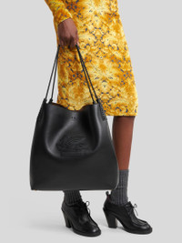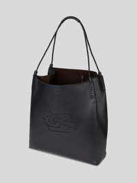 Large Libra leather tote bag embellished with an embroidered patch featuring the ETRO logo and Pegaso symbol on the front. Braided handles and threading on the corners of the bag. Suede interior and clasp closure. This accessory features a convenient suede clutch inside. • Size: 37.5 x 38.5 x 14 cm • Clasp closure • Two handles • Metal feet • Made in Italy PRODUCT DETAILS • 100% leather