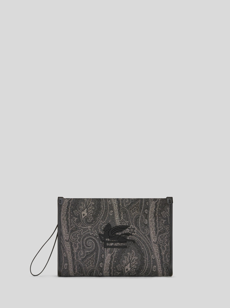Large pouch in ETRO's iconic Paisley jacquard fabric embellished by 3D-effect embroidered ETRO Pegaso logo and features a detachable wrist strap. PRODUCT DETAILS • 30 x 20 x 5 cm / 11.81 x 7.87 x 1.96 inches • Exterior: 76% cotton. 24% polyester • Finish: 100% calfskin • Interior: 100% polyester • Embroidery: 100% polyester • Zip fastening • Inside patch pocket • Detachable wrist strap length (drop) 18 cm / 7.08 inches • Gold-finish metal accessories • Made in Italy