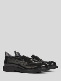 Leather penny loafers with rear silk-blend insert embellished with tie-inspired geometric micro motif. • Made in Italy PRODUCT DETAILS • Upper: 100% cowhide • Lining: 100% calfskin • Insole: 100% cowhide • Sole: 100% polyethylene • Tongue: 100% cowhide • Appliques: 70% polyester, 30% silk