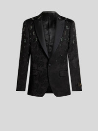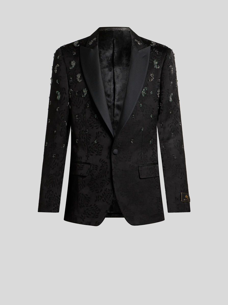 Linen-blend tuxedo jacket with plain-coloured satin lapels. This model is embellished with a foliage jacquard motif all over and crystal-embroidered Paisley pattern at the top. The lining features a tone-on-tone mini-leaf motif. Completing the garment is a tailor's label with the Pegaso logo, hand-stitched onto the cuff. • Slim fit • Single-breasted closure with fabric button • Peak lapels • Side slip pockets with flap • Cuffs with four fabric buttons • Made in Italy • The model is 6' 1½" (187 cm) tall and wears a size 48 PRODUCT DETAILS • 56% linen, 44% viscose • Lining: 100% viscose