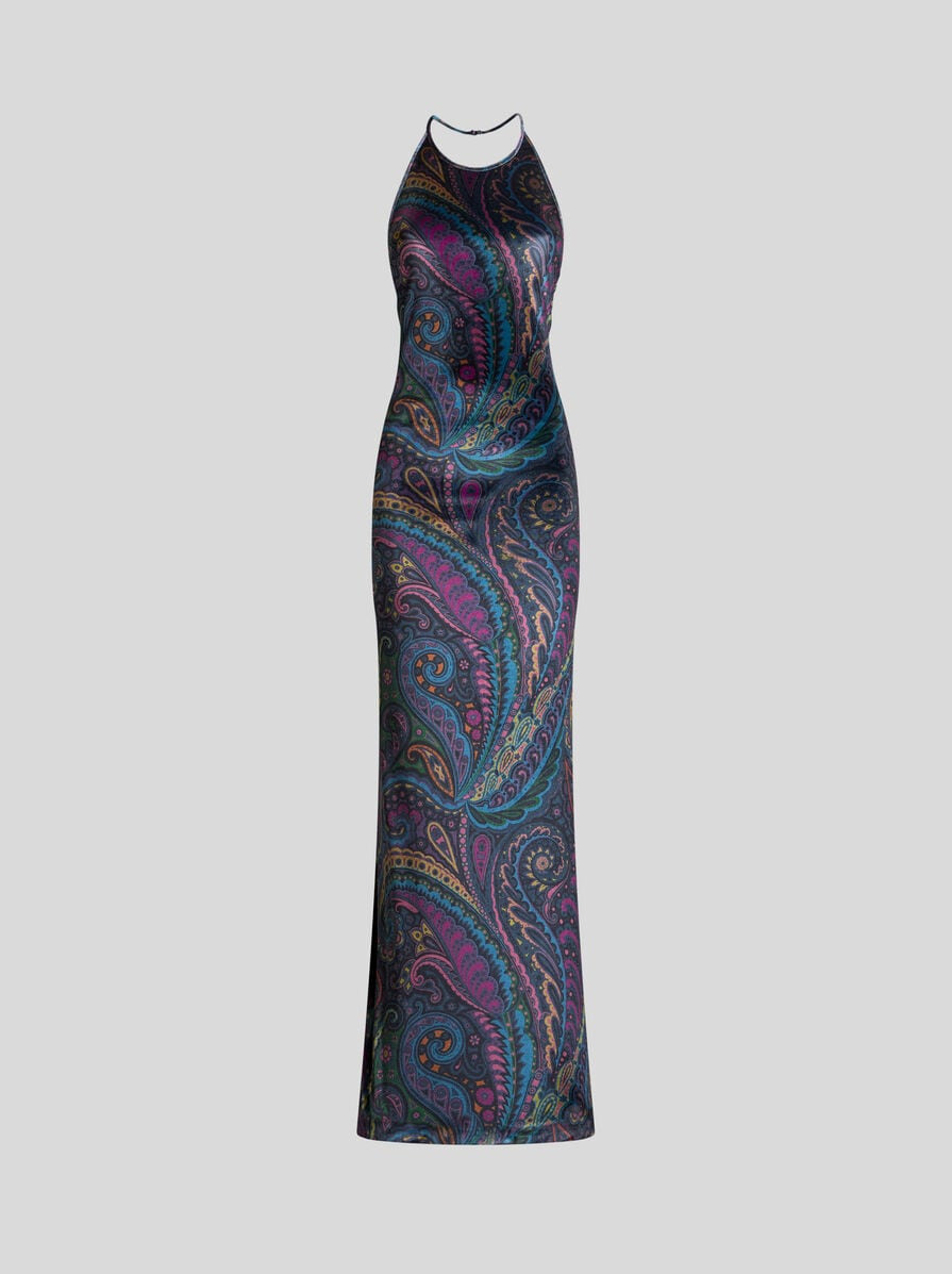 Long dress in soft stretch chenille with all-over, multicoloured Paisley print. This slim-fitting garment features a halterneck design that leaves the back open. • Slim fit • Crew neck with button at the back • Rear zip closure • Made in Italy • The model is 5' 9½" (177 cm) tall and wears a size 40 PRODUCT DETAILS • 93% polyester, 7% elastane • Lining: 100% viscose