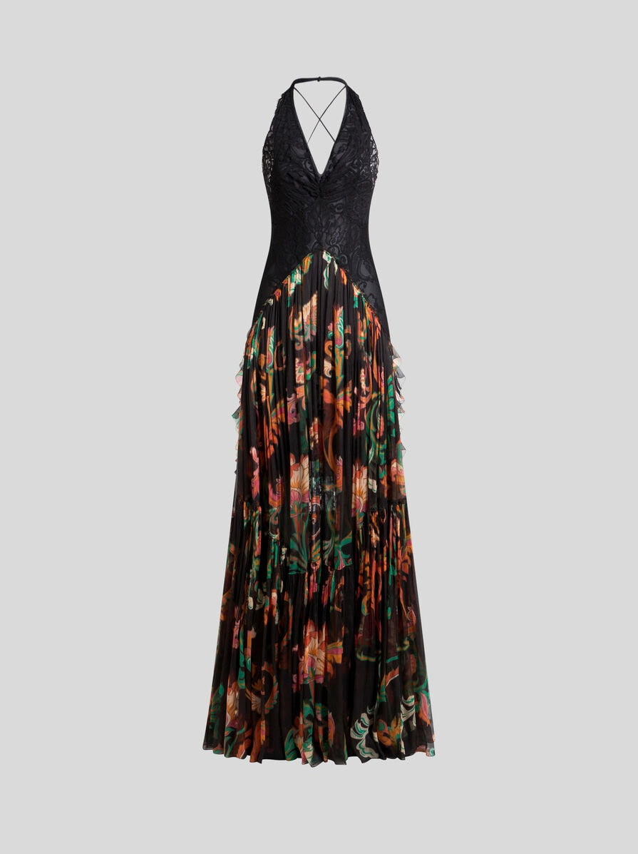 Boho-style long dress with slim-fitting lace bodice, which is longer at the back and boasts a see-through effect. This sleeveless garment with plunging V-neck, inspired by a piece presented at the Spring-Summer 25 Women's Runway Show, is enhanced by a skirt in light silk crepon with voluminous flounce, all-over floral print and train. At the rear, the criss-crossing spaghetti straps leave part of the back open. PRODUCT DETAILS • 100% silk • Lace: 81% polyamide, 19% cotton • Lining: 100% polyester