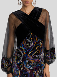 Long dress in soft silk-blend velvet with distinctive, refined Paisley foliage motif all over. The bodice features wide puff sleeves in see-through-effect tulle and a plain-coloured velvet crossover insert. • Regular fit • Crossover neck at the front • V-neck at the back • Long puff sleeves • Rear zip closure • Made in Italy • The model is 5' 9½" (176 cm) tall and wears a size 40 PRODUCT DETAILS • Plain-coloured upper part: 80% viscose, 20% silk • Tulle sleeves: 100% polyamide • Printed part: 82% viscose, 18% silk • Lining: 100% polyester