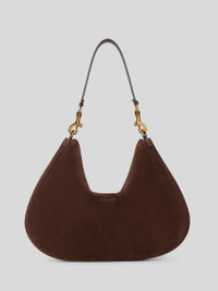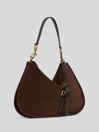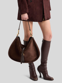 Soft-structured maxi Pony bag in suede. This item features two closures: a buttoned main one and a second one with a functional metal buckle. This model, presented at the Autumn-Winter 25 Runway Show, includes a handle with Paisley detail at the clasps for hobo bag-style shoulder wear. • Dimensions (Width, Height, Depth): 17.5 x 12.4 x 1.2 inches (44.5 x 31.5 x 3 cm) • Magnetic and buckle closures • Interchangeable handle and shoulder strap • Golden-finish metal accessories • Made in Italy PRODUCT DETAILS • Exterior: calfskin • Lining: cowhide