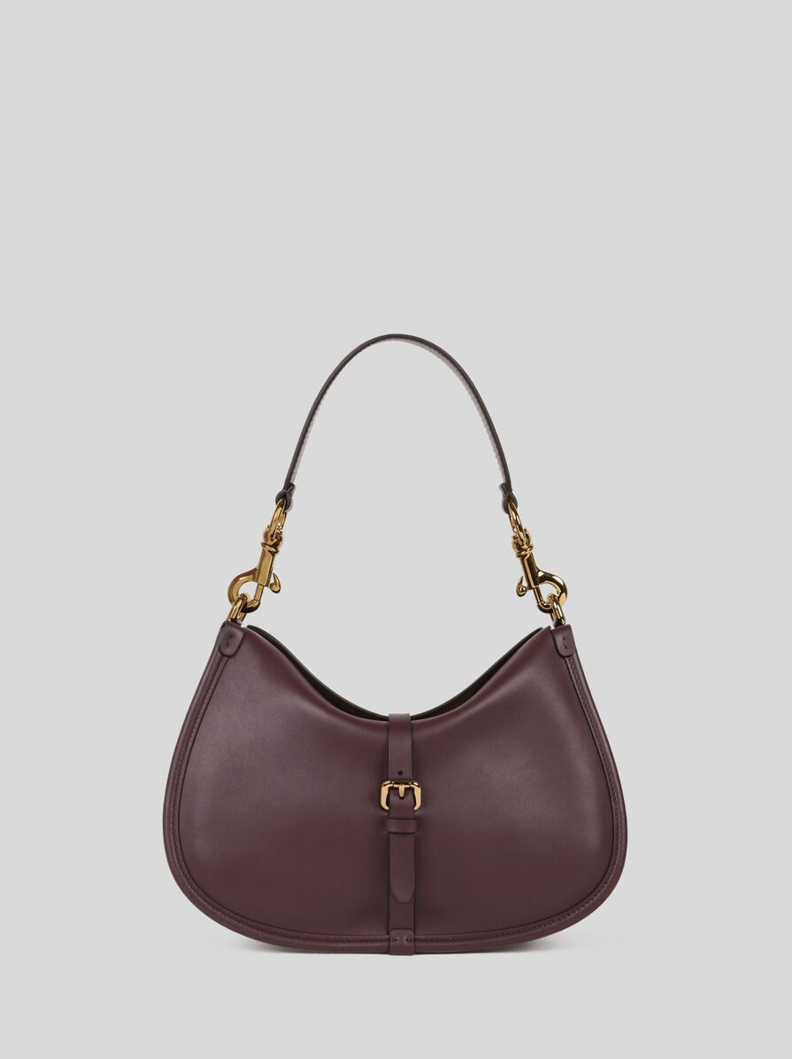 Soft-structured Pony bag in plain-coloured leather with suede interior. This item features two closures: the main one with a magnetic button embellished with ETRO logo and Pegaso symbol, engraved using the same technique used to mint coins; and a second with a functional metal buckle. This model includes an interchangeable handle and shoulder strap with Paisley-patterned detail at the clasps. • Dimensions (Width, Height, Depth): 11.4 x 7.9 x 3.9 inches (29 x 20 x 10 cm) • Magnetic and buckle closures • Internal slip pocket • Interchangeable handle and shoulder strap • Golden-finish metal accessories • Made in Italy PRODUCT DETAILS • Exterior: calfskin • Lining: cowhide