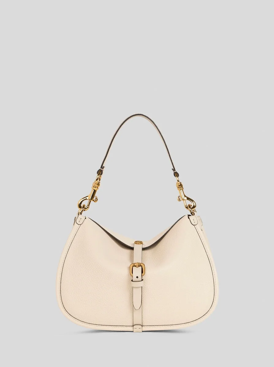 Soft-structured medium Pony bag in plain-coloured tumbled leather with suede interior. This item features two closures: the main one with a magnetic button embellished with ETRO logo and Pegaso symbol, engraved using the same technique used to mint coins; and a second with a functional metal buckle. This model, presented at the Autumn-Winter 25 Runway Show, includes an interchangeable handle and shoulder strap with Paisley-patterned detail at the clasps. • Dimensions (Width, Height, Depth): 11.8 x 8.3 x 3.9 inches (30 x 21 x 10 cm) • Magnetic and buckle closures • Internal slip pocket • Interchangeable handle and shoulder strap • Golden-finish metal accessories • Made in Italy PRODUCT DETAILS • Exterior: calfskin • Lining: cowhide