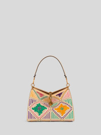 Iconic medium Vela bag in cotton with distinctive, refined, raised raffia floral embroidery all over. This model can be carried by hand or on the shoulder thanks to the detachable and interchangeable strap and handle. This piece stands out for its distinctive metal closure and the medallion bearing the ETRO logo and Pegaso symbol engraved using the same technique used to mint coins. This accessory, presented at the Spring-Summer 25 Women's Runway Show, is equipped with a convenient clutch with zip closure inside. • Dimensions (Width, Height, Depth): 11 x 8.5 x 4.3 inches (28 x 21.5 x 11 cm) • Removable handle and shoulder strap • Metal feet • Light golden-finish metal details • Removable mini pouch • Made in Italy PRODUCT DETAILS • 100% cotton • Detailing: calfskin