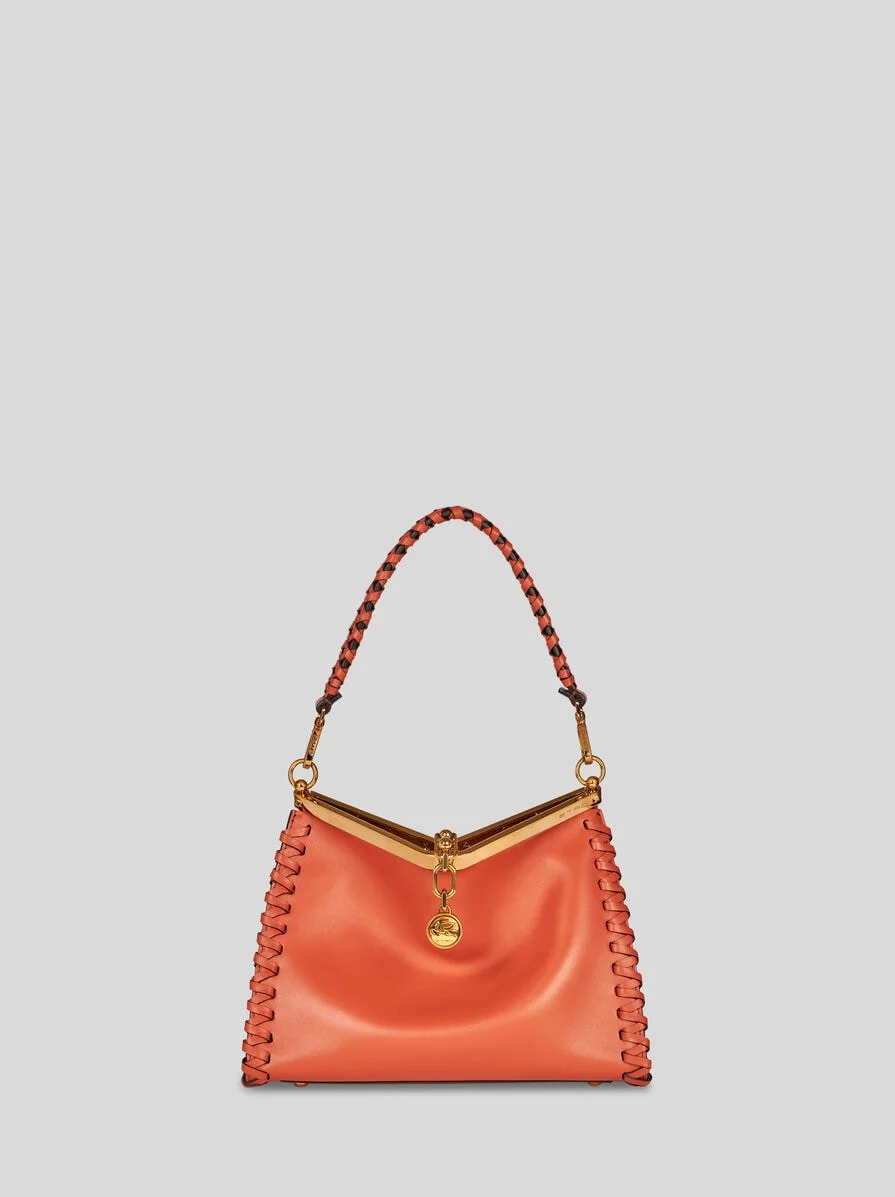 Iconic medium Vela bag in leather with thread work at the sides. This model can be carried by hand or on the shoulder thanks to the detachable and interchangeable strap and handle. This model stands out for its distinctive metal fastening and the medallion bearing the ETRO logo and Pegaso symbol engraved using the same technique used to mint coins. Complete with a convenient, zip-fastened suede clutch inside. PRODUCT DETAILS • 11.02 x 8.26 x 4.72 inches (28 x 21 x 12 cm) • Exterior: 100% calfskin • Interior: 100% calfskin • Short handle, length 9.44 inches (24 cm) - drop • Detachable shoulder strap length 18.8 inches (48 cm) - drop • Metal feet • Removable mini pouch • Light golden-finish metal accessories • Made in Italy