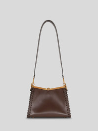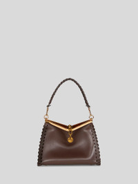 Iconic medium Vela bag in leather with thread work at the sides. This model can be carried by hand or on the shoulder thanks to the detachable and interchangeable strap and handle. This model stands out for its distinctive metal fastening and the medallion bearing the ETRO logo and Pegaso symbol engraved using the same technique used to mint coins. Complete with a convenient, zip-fastened suede clutch inside. PRODUCT DETAILS • 11.02 x 8.26 x 4.72 inches (28 x 21 x 12 cm) • Exterior: 100% calfskin • Interior: 100% calfskin • Short handle, length 9.44 inches (24 cm) - drop • Detachable shoulder strap length 18.8 inches (48 cm) - drop • Metal feet • Removable mini pouch • Light golden-finish metal accessories • Made in Italy