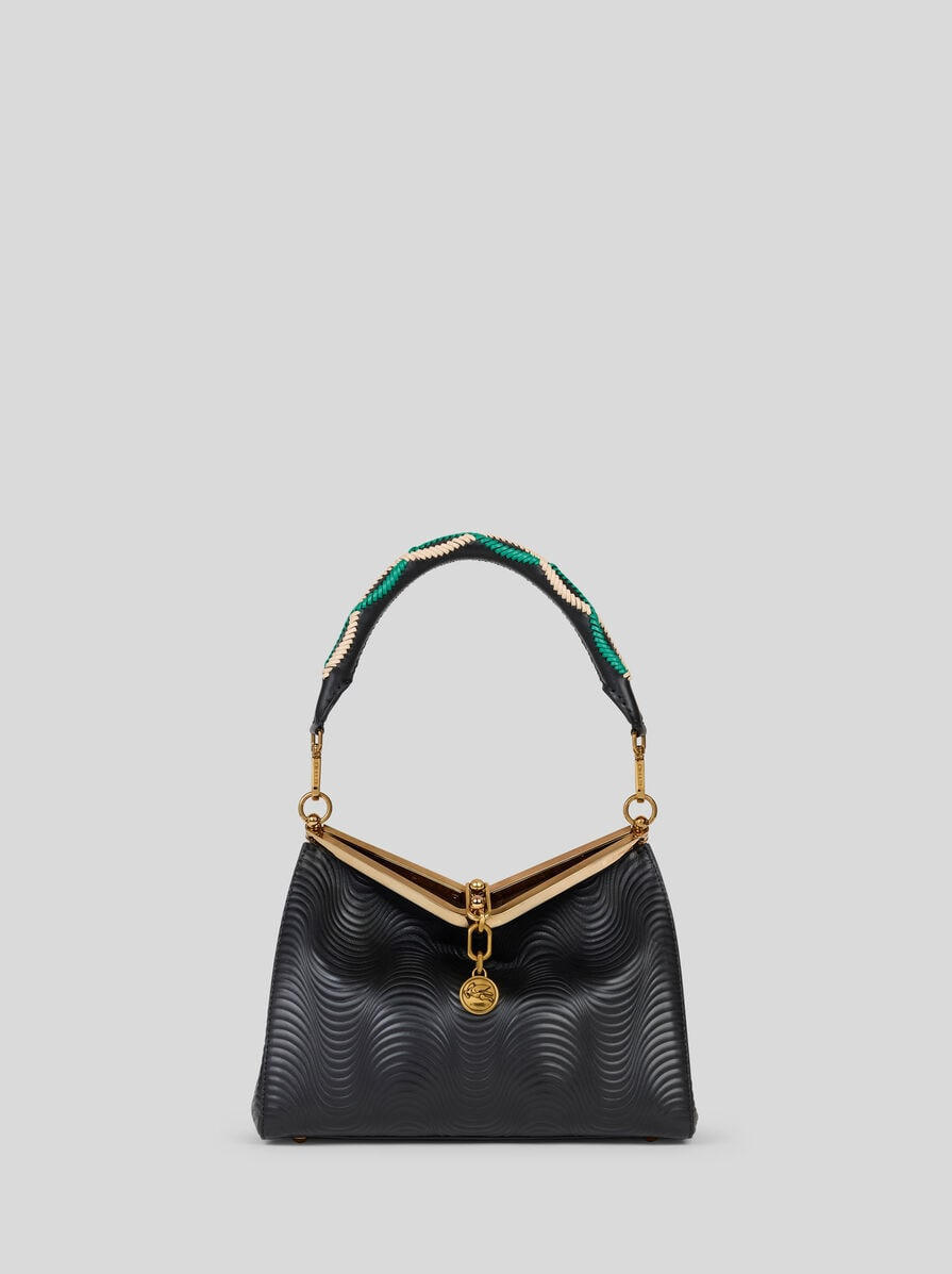 Iconic medium Vela bag in leather with distinctive wavy motif. This model can be carried by hand or on the shoulder thanks to the detachable and interchangeable strap and handle. The handle stands out thanks to the original contrasting threading. This piece stands out for its distinctive metal closure and the medallion bearing the ETRO logo and Pegaso symbol engraved using the same technique used to mint coins. The accessory was presented at the Spring-Summer 25 Women's Runway Show. • Dimensions (Width, Height, Depth): 11 x 8.5 x 4.3 inches (28 x 21.5 x 11 cm) • Removable handle • Light golden-finish metal details • Made in Italy PRODUCT DETAILS • 100% calfskin