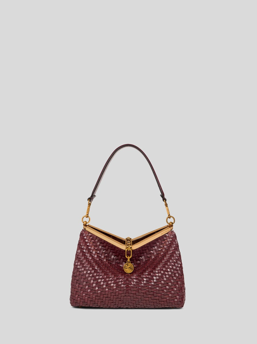 Iconic medium Vela bag in plain-coloured woven leather with suede interior. This model can be carried by hand or on the shoulder thanks to the detachable and interchangeable strap and handle. This piece stands out for its distinctive metal closure and the medallion bearing the ETRO logo and Pegaso symbol engraved using the same technique used to mint coins. • Dimensions (Width, Height, Depth): 11 x 8.5 x 4.3 inches (28 x 21.5 x 11 cm) • Removable handle • Detachable shoulder strap • Metal feet • Golden-finish metal accessories • Removable mini pouch • Made in Italy PRODUCT DETAILS • Exterior: leather • Lining: cowhide
