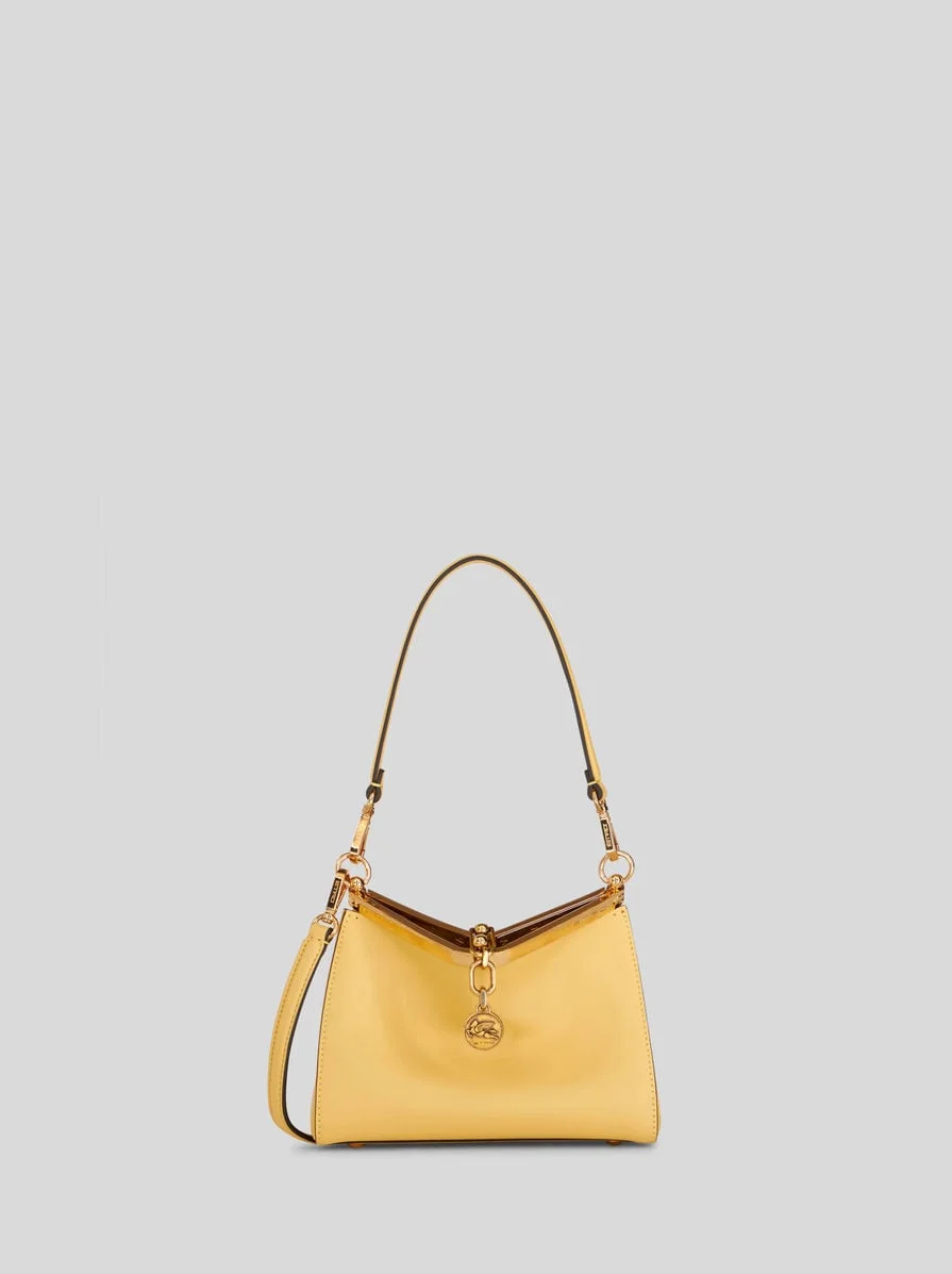 Mini Vela bag in leather with metal chain closure enhanced by a medallion bearing the ETRO logo and Pegaso symbol. This bag is perfect to carry on the shoulder or crossbody. • Dimensions (Width, Height, Depth): 8.3 x 6.3 x 3.5 inches (21 x 16 x 9 cm) • Short shoulder strap, length (drop) 10.6 inches (27 cm) • Detachable adjustable shoulder strap, 21.7 inches (55 cm) long (drop) • Metal feet • Light golden-finish metal accessories • Made in Italy PRODUCT DETAILS • Exterior: 100% calfskin • Interior: 100% cowhide