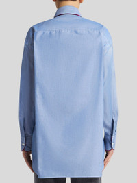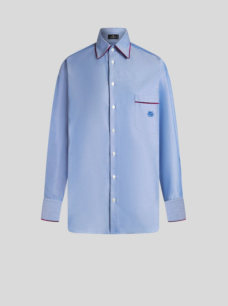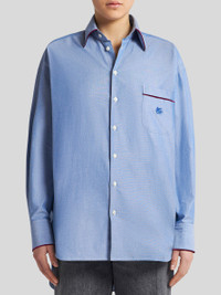 Straight-cut, relaxed-fit shirt in Oxford cotton fabric with contrasting velvet trims. This model is embellished with an embroidered Pegaso symbol and ETRO logo on the chest. • Fit larger than size shown - we recommend ordering one size smaller • Spread collar • Long sleeves • Working cuffs • Breast patch pocket • Button closure • Made in Italy • The model is 5’10” (178 cm) tall and wears a size 40 (IT) PRODUCT DETAILS • 100% cotton