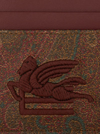 Card holder in ETRO's iconic Paisley jacquard fabric embellished by embroidered ETRO Pegaso logo. PRODUCT DETAILS • 10.5 x 8 cm / 5.70 x 4.13 inches • Exterior: Canvas-lined coated Paisley jacquard cotton with matt grain • Rear: 100% cotton • Details in PVC • Finish: 100% calfskin • Embroidery: 100% polyester • Interior: 100% calfskin • Lining: 100% nylon • Five card spaces • Made in Italy