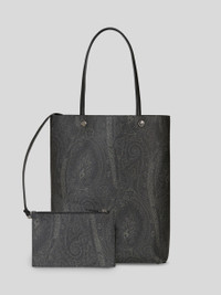Medium-size tote bag in iconic Paisley jacquard fabric, with leather details. This item comes with a removable inner clutch. • Size: 14.96 x 116.14 x 4.72 inches (38 x 29,5 x 12 cm) • Removable mini pouch • Golden-finish metal accessories • Made in Italy PRODUCT DETAILS • Exterior: Paisley jacquard cotton fabric coated with matt texture and lined with canvas • Coating: 100% PVC