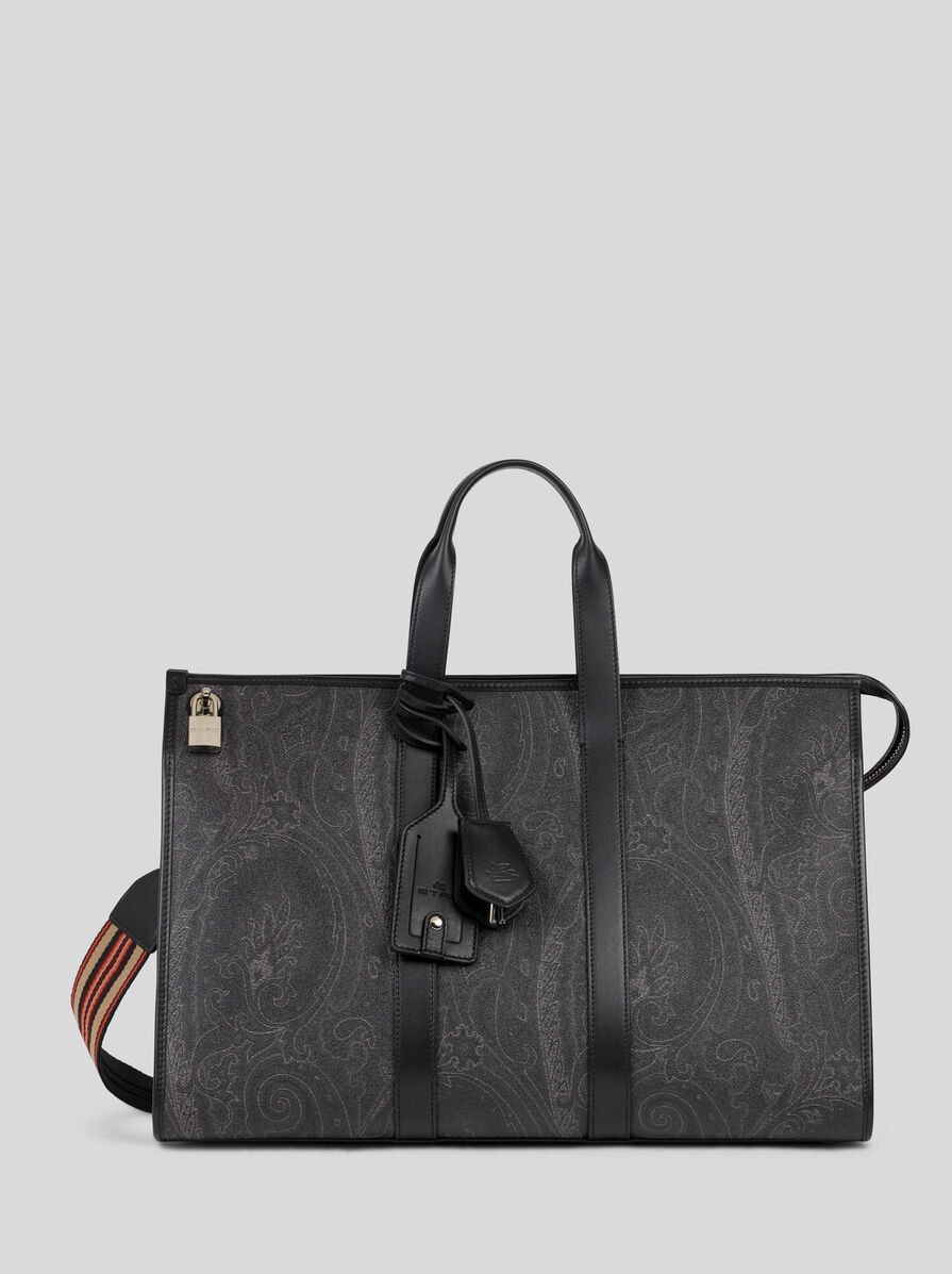 Travel bag in iconic Paisley jacquard fabric with striped shoulder strap, two handles and leather trims. This accessory is enhanced by its removable metal padlock and two removable tags: one with Pegaso logo and the other with Etro lettering. This bag is perfect to carry by hand or worn crossbody. • Dimensions (Width, Height, Depth): 17.7 x 12.2 x 9.4 inches (45 x 31 x 24 cm) • Internal zip pocket • Zip closure • Two short handles • Shoulder strap • Removable tags • Removable padlock • Golden-finish metal accessories • Made in Italy PRODUCT DETAILS • Exterior: Paisley jacquard cotton fabric coated with matt texture and lined with canvas • Coating: 100% PVC • Detailing: 100% leather • Ribbon: 95% polyester, 5% polyamide • Lining: 50% polyurethane, 50% polyamide