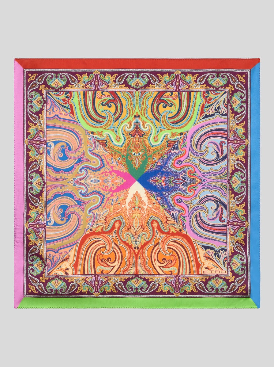 Pure silk twill pocket square with geometric Paisley motif and plain-coloured edges. This accessory is complete with an ETRO logo in the corner. • Size: 16.9 x 16.9 inches (43 x 43 cm) • Made in Italy PRODUCT DETAILS • 100% silk