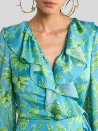 Long wrap dress in fine Peau d'Ange silk embellished with elegant all-over floral motif. This item features an elongated hem at the back and delicate ruffles adorning the plunging V-neck and skirt edges. The thin matching waist tie belt completes the garment. • Regular fit • V-neck • Long sleeves • Matching waist tie belt • Made in Italy • The model is 5' 9½" (176 cm) tall and wears a size 40 PRODUCT DETAILS • Exterior: 100% silk • Lining: 100% polyester