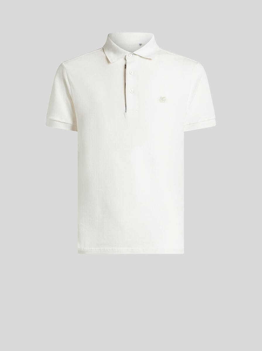 Cotton pique polo shirt embellished with floral Paisley-printed details. This model is embellished with a tone-on-tone embroidered Pegaso symbol and ETRO logo on the chest. • Regular fit • Made in Italy • The model is 6’1”(186 cm) tall and wears a size M PRODUCT DETAILS • 100% cotton