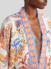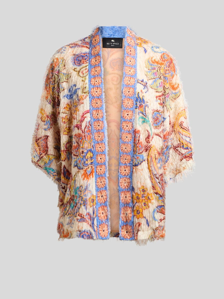 Short fil coupe kesa robe with fringing and decorative, placed floral print. • Regular fit • Kimono sleeves • Made in Italy • The model is 5' 9½" (177 cm) tall and wears a size 40 PRODUCT DETAILS • 100% viscose • Lining: 100% silk