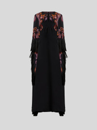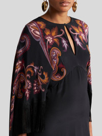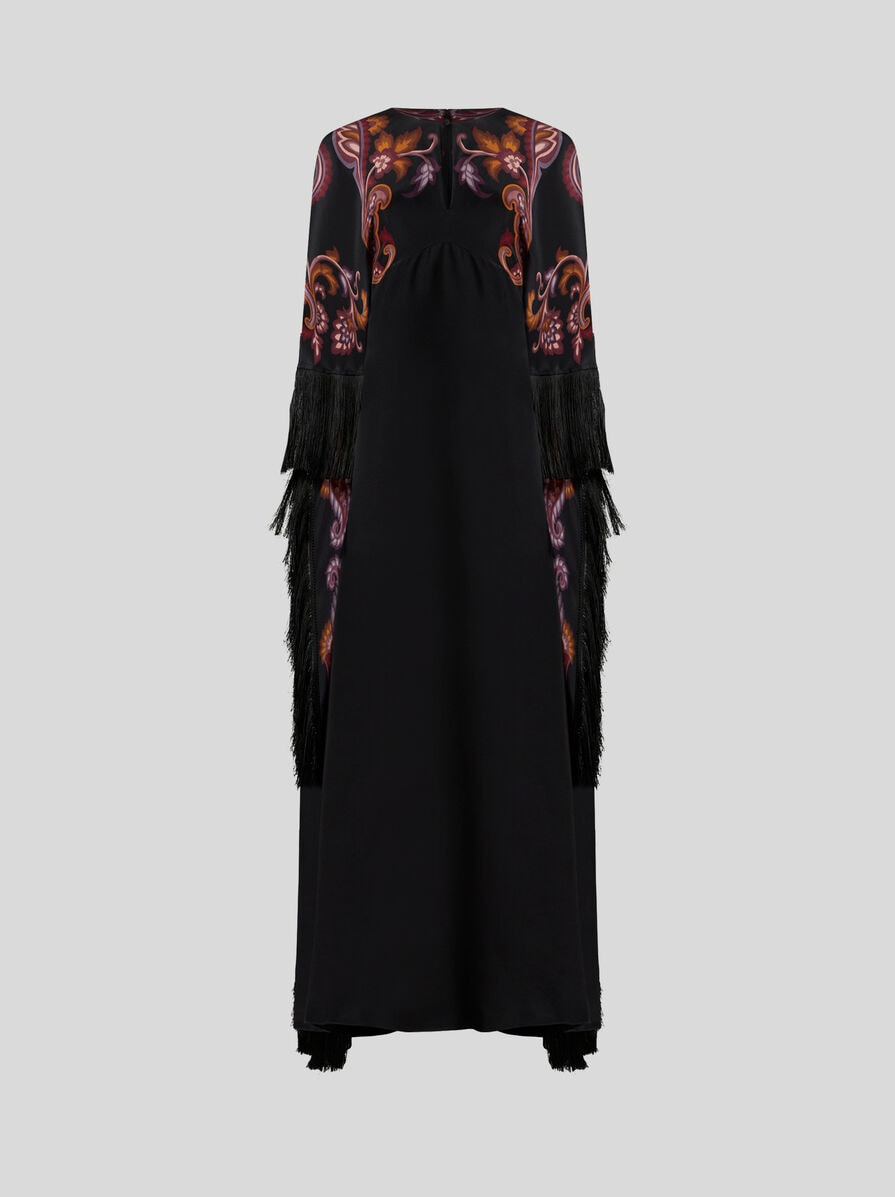 Long silk dress with cape detail and placed print. This model is complete with tone-on-tone fringes at the sleeves and hem. • Loose fit • Crewneck with buttoned keyhole • Made in Italy • The model is 5' 9½" (177 cm) tall and wears a size 40 PRODUCT DETAILS • 100% silk • Fringe details: 100% acetate