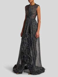 Long dress in printed lightweight silk crepon. This model features maxi-ruched detailing. • Regular fit • Crew neck • Rear zip closure • Made in Italy • The model is 5’10” (178 cm) tall and wears a size 40 (IT) PRODUCT DETAILS • 100% silk • Embellishment: 100% polyester • Lining: 100% polyester