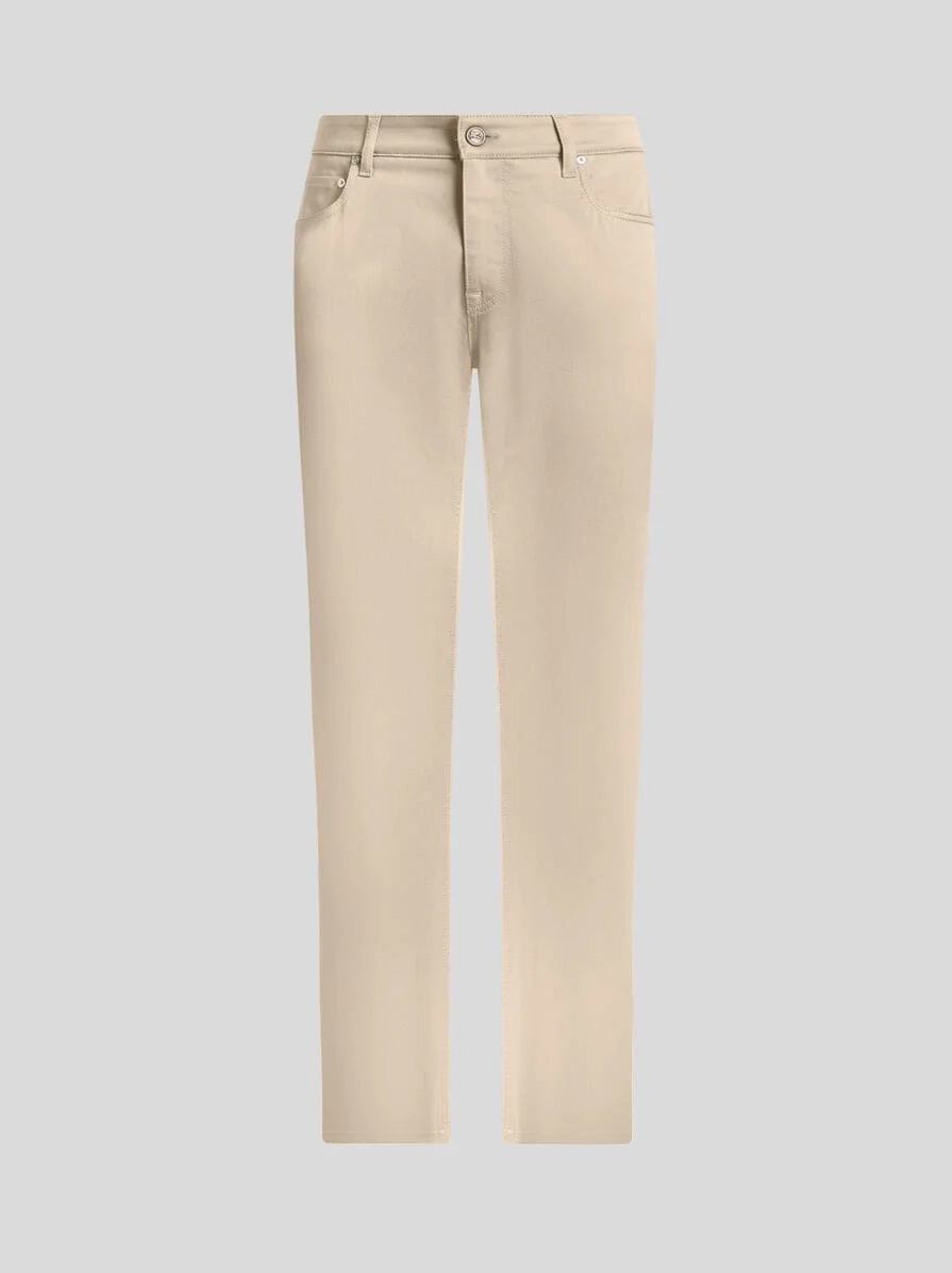 Jeans in plain-coloured stretch cotton gabardine. This five-pocket model is complete with a rear label featuring the Pegaso symbol and ETRO logo. • Regular fit • Five-pocket model • Concealed zip and Pegaso button closure • Rear label with ETRO logo and Pegaso • Made in Italy • The model is 6' 1" (186 cm) tall and wears a size 32 PRODUCT DETAILS • 97% cotton, 3% elastane