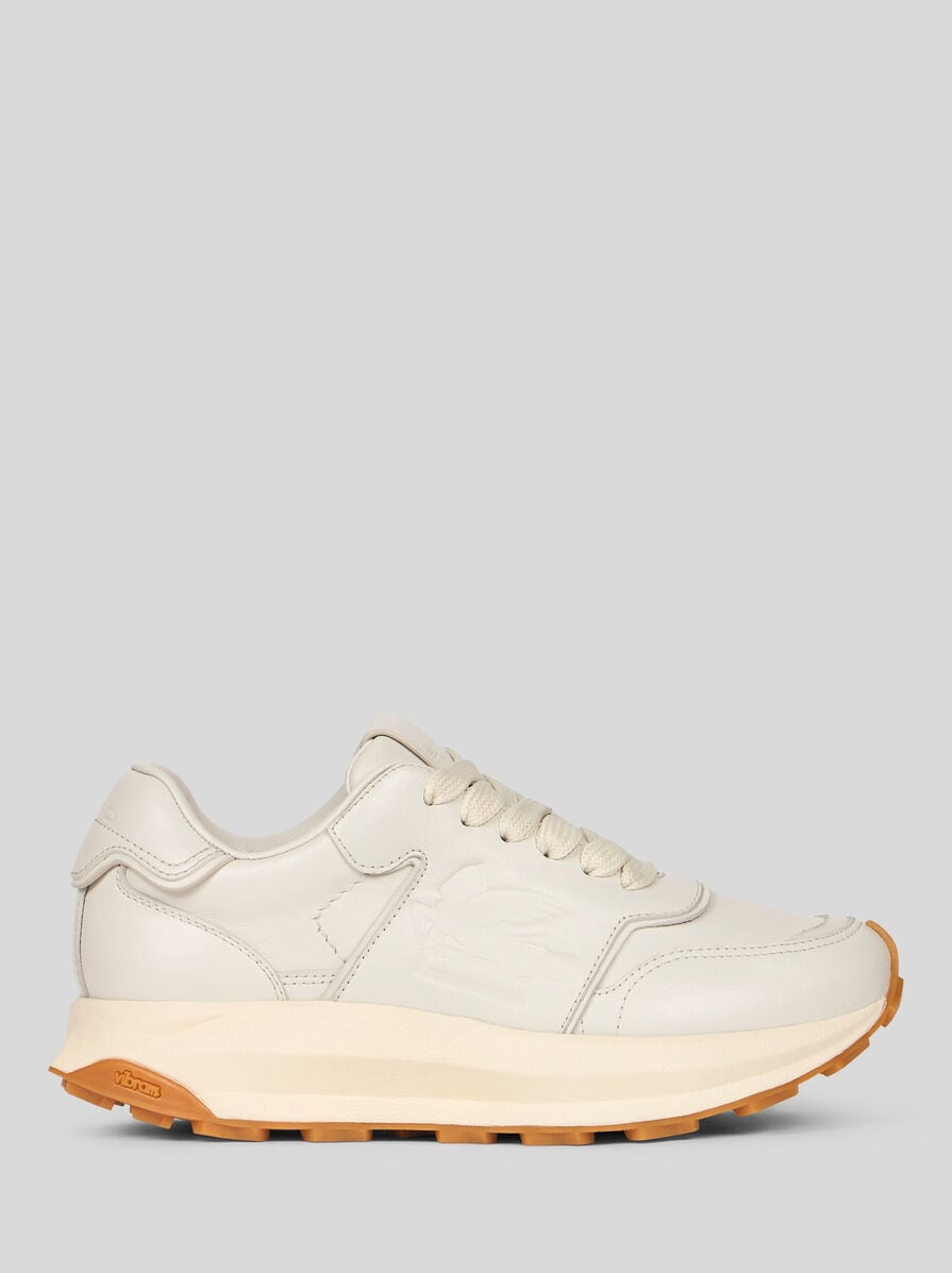Lace-up running sneakers in leather, featuring the ETRO monogram and Pegaso symbol embossed on the side and ETRO lettering on the counter and tongue. Completing the model is the Vibram sole, ensuring maximum grip. • Lace fastening • Made in Italy PRODUCT DETAILS • Upper: 100% cowhide • Lining: 100% cowhide • Sole: 100% elastodiene • Laces: 100% cotton