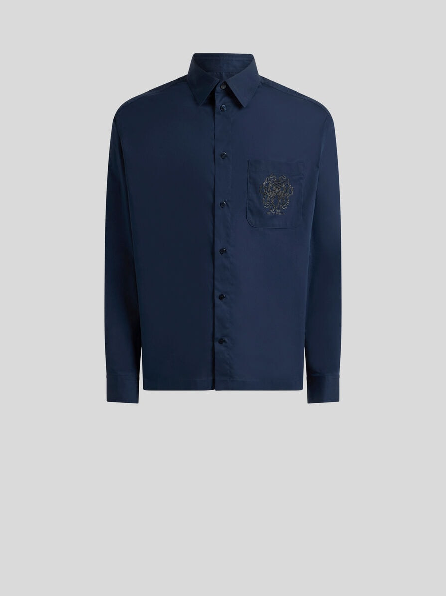 Slightly cropped shirt in stretch cotton fabric with breast pocket sporting an embroidered octopus and ETRO logo. • Regular fit • Pointed collar • Long sleeves • Breast pocket • Double-buttoned working cuffs • Made in Italy • The model is 6' 1½" (187 cm) tall and wears a size 39 PRODUCT DETAILS • 97% cotton, 3% elastane