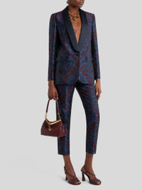 Straight-cut, single-breasted jacket in silk-blend fabric with distinctive, multicoloured jacquard motif. It features contrasting lapels and a button covered in soft plain-coloured satin. • Regular fit • Shawl lapels • Single-breasted, single-button closure • Front pockets with flap • Made in Italy • The model is 5' 9½" (177 cm) tall and wears a size 40 PRODUCT DETAILS • 86% polyester, 14% silk • Lapels: 100% polyester • Lining: 52% viscose, 48% acetate