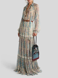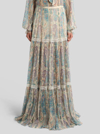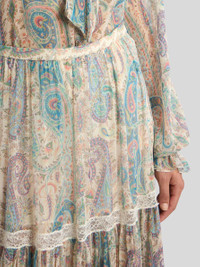 Maxi skirt in lightweight pure silk crepon embellished with all-over Paisley motif featuring foliage-inspired elements. This high-waisted piece stands out for its flounces interspersed with delicate lace inserts. • Regular fit • High waist • Rear zip closure • Made in Italy • The model is 5' 9½" (176 cm) tall and wears a size 40 PRODUCT DETAILS • 100% silk