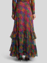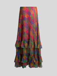 SILK CREPON MAXI SKIRT WITH RUFFLES AND GEOMETRIC PAISLEY MOTIF
