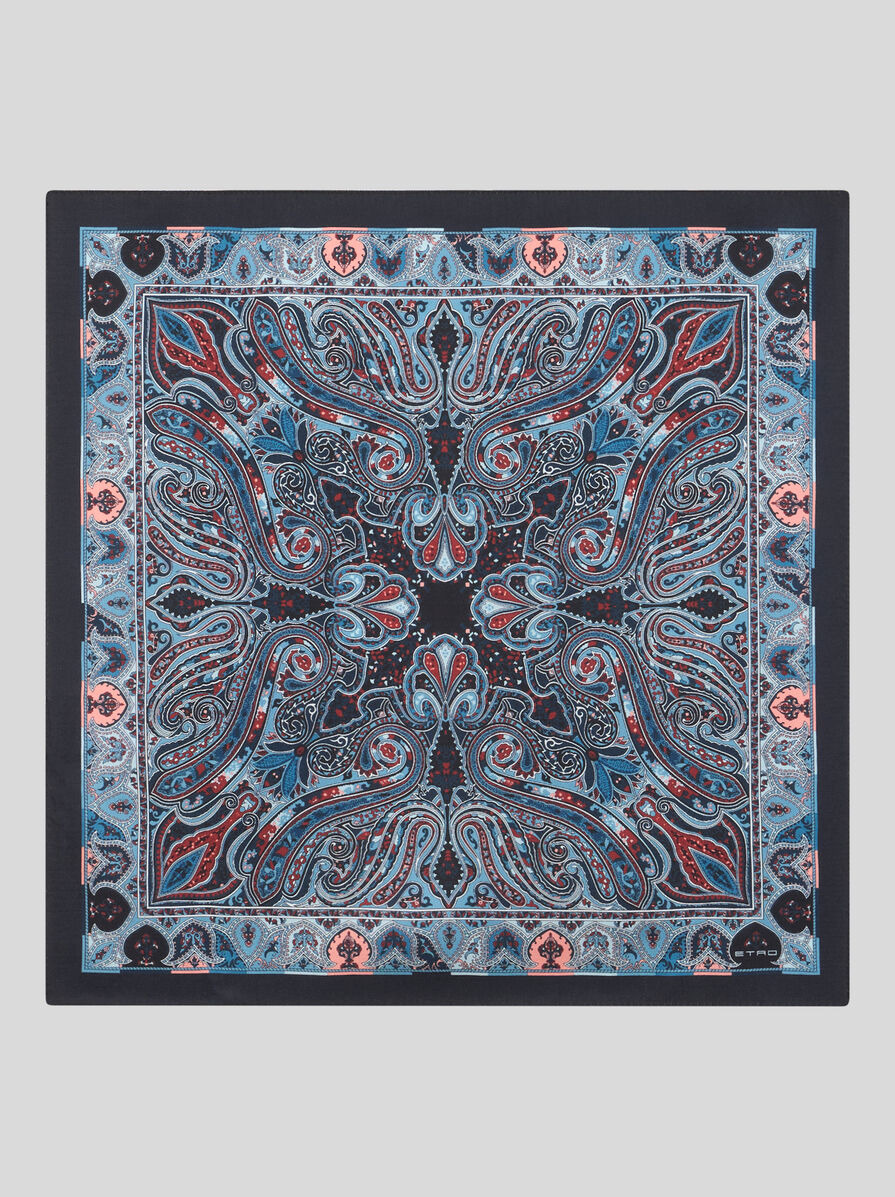 Pure silk twill jacquard pocket square with distinctive abstract Paisley motif and geometric-patterned edges. This accessory is complete with an ETRO logo in the corner. • Size: 16.9 x 16.9 inches (43 x 43 cm) • Made in Italy PRODUCT DETAILS • 100% silk