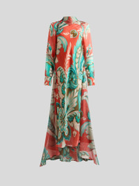 Relaxed-fit midi dress in washed silk organza with long sleeves. This model features a placed floral print and stands out for its collar with integrated bandana and long drapes down the sides. The item was presented at the Autumn-Winter 25 Runway Show. • Regular fit • Collar with integrated bandana • Long raglan sleeves • Cuffs with slits and button • Made in Italy • The model is 5' 9½" (176 cm) tall and wears a size 40 PRODUCT DETAILS • 100% silk • Lining: 100% polyester