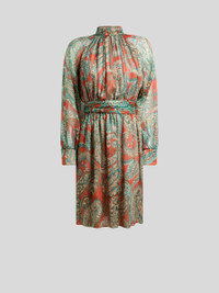 Knee-length mini dress in lightweight pure silk pekin crepon with all-over floral Paisley print. This model is enhanced by a matching sash that ties into a knot at the waist and is finished with gathering at the waist and neck. The item was presented at the Autumn-Winter 25 Runway Show. • Regular fit • Buttoned stand-up collar • Keyhole opening at the front • Long raglan sleeves • Buttoned working cuffs • Waist sash • Made in Italy • The model is 5' 9½" (176 cm) tall and wears a size 40 PRODUCT DETAILS • 100% silk • Lining: 100% polyester