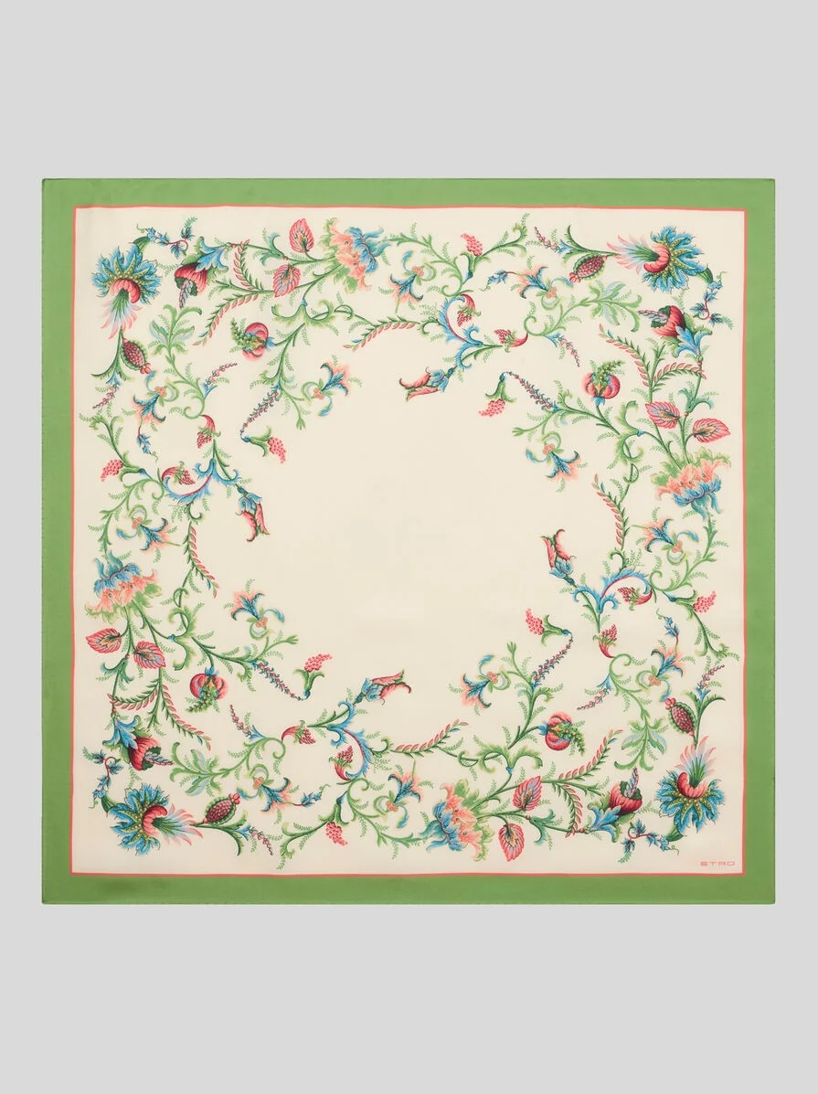 Pure silk twill scarf embellished with circular floral-inspired motif. Completing the accessory are plain-coloured edges and the iconic ETRO logo. • Size: 35.4 x 35.4 inches (90 x 90 cm) • Made in Italy PRODUCT DETAILS • 100% silk