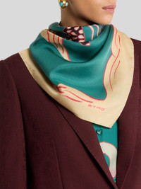 Pure silk twill scarf embellished with placed graphic motif inspired by the animal world and designed by artist Maria Jeon. This accessory, presented at the Autumn-Winter 25 Runway Show, is complete with contrasting edging with the ETRO logo. • Size: 35.4 x 35.4 inches (90 x 90 cm) • Made in Italy PRODUCT DETAILS • 100% silk