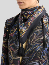 Pure silk scarf embellished with Paisley motif featuring foliage-inspired elements. This accessory features a plain-coloured edge with decorative tassels in the corners. • Size: 27.6 x 27.6 inches (70 x 70 cm) • Made in Italy PRODUCT DETAILS • Exterior: 100% silk • Fringe details: 100% viscose