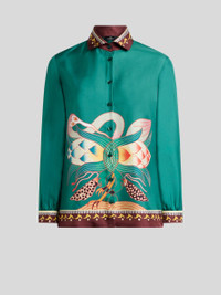 Pure silk twill shirt with distinctive, placed animal-inspired graphic print designed by artist Maria Jeon and finished with a contrasting abstract pattern on the collar, cuffs and hem. The item was presented at the Autumn-Winter 25 Runway Show. • Boyfriend slim fit • Branded-button closure • One-button working cuffs • Yoke with inverted pleat on the back • Made in Italy • The model is 5' 9½" (176 cm) tall and wears a size 40 PRODUCT DETAILS • 100% silk