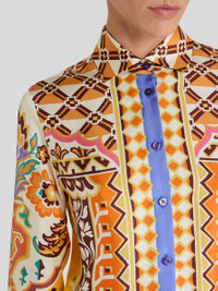 Shirt in pure silk twill with placed floral- and geometric-patterned print. The contrasting edging completes the garment. • Boyfriend slim fit • Classic collar • Button closure • Long sleeves • One-button working cuffs • Made in Italy • The model is 5' 9½" (177 cm) tall and wears a size 40 PRODUCT DETAILS • 100% silk