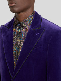 Single-breasted blazer with lining embellished with a refined, contrasting multicoloured floral motif and contrasting undercollar and inner collar featuring the iconic Paisley motif. • Roma regular fit • Peak lapels • Single-breasted button closure • Two flap pockets at the front and welt breast pocket • Working cuffs • Label with Etro logo and Pegaso symbol on the cuff • Made in Italy • The model is 6' 1½" (187 cm) tall and wears a size 48 PRODUCT DETAILS • Exterior: 98% cotton, 2% elastane • Neck: 78% silk, 22% polyester • Lining: 100% viscose