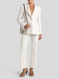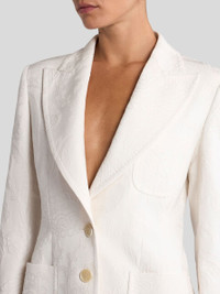 Jacket in slightly stretchy cotton-blend jacquard fabric embellished with tone-on-tone rebrode Paisley motif featuring floral and foliage-inspired elements. This fitted item features three large patch pockets on the front and is complete with a single-breasted closure with Pegaso buttons. • Fitted • Peak lapels • Single-breasted closure with two Pegaso buttons • Three front patch pockets • Rear vent • Made in Italy • The model is 5' 9½" (176 cm) tall and wears a size 40 PRODUCT DETAILS • Exterior: 59% cotton, 40% viscose, 1% elastane • Lining: 52% viscose, 48% acetate