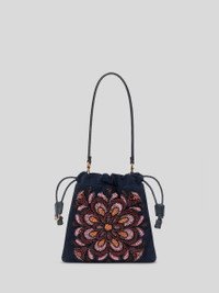 Small Kalispera sack bag in suede with floral embroidery featuring glass beads and braided drawstring closure. The practical detachable handle makes it ideal to carry by hand or on the shoulder. • Dimensions (Width, Height): 8.7 x 8.7 inches (22 x 22 cm) • Braided drawstring closure • Internal patch pocket • Removable handle • Made in Italy PRODUCT DETAILS • Goatskin • Details: calfskin • Embroidery: 100% glass beads • Lining: 100% polyester