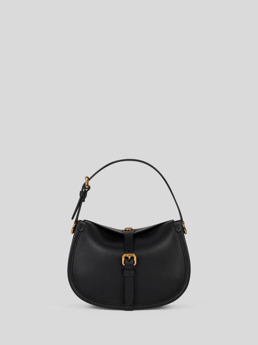Soft-structured small Pony bag in plain-coloured leather. This item features two closures: the main one with a magnetic button embellished with ETRO logo and Pegaso symbol, engraved using the same technique used to mint coins; and a second with a functional metal buckle. This model, presented at the Autumn-Winter 25 Runway Show, includes a fixed handle and detachable shoulder strap. • Dimensions (Width, Height, Depth): 8.9 x 6.3 x 2.8 inches (22.5 x 16 x 7 cm) • Magnetic and buckle closures • Fixed handle and detachable shoulder strap • Golden-finish metal accessories • Made in Italy PRODUCT DETAILS • Exterior: calfskin • Lining: cowhide
