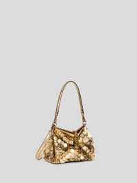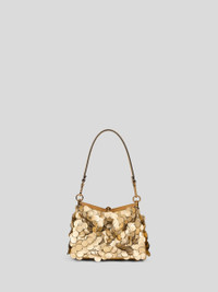 Small Vela bag covered in elegant, shiny maxi sequins in gold-coloured laminated leather. This model stands out for its distinctive metal closure finished with the symbolic minted coin featuring the Pegaso logo. The design is complete with an interchangeable handle and shoulder strap for hand, shoulder or crossbody carry. • Dimensions (Width, Height, Depth): 8.3 x 6.3 x 3.9 inches (21 x 16 x 10 cm) • Interchangeable handle and shoulder strap • Gold-finish metal accessories • Made in Italy PRODUCT DETAILS • Exterior: sheep leather • Interior: cowhide