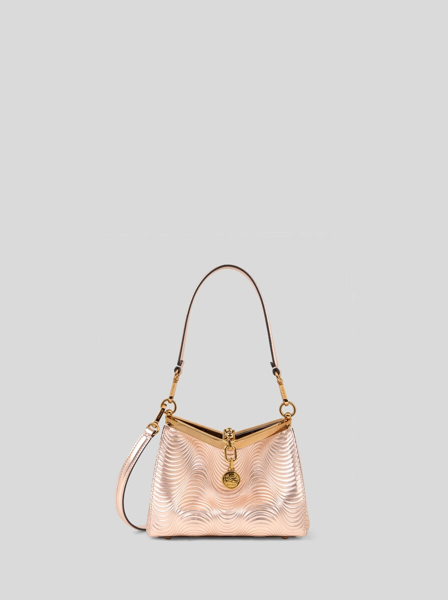 Iconic small Vela bag in laminated leather with wavy motif. This model can be carried by hand or on the shoulder, thanks to the detachable, interchangeable shoulder strap and handle. This piece stands out for its distinctive metal closure and the medallion bearing the ETRO logo and Pegaso symbol engraved using the same technique used to mint coins. • Size (Width, Height, Depth): 8.3 x 6.3 x 3.9 inches (21 x 16 x 10 cm) • Short shoulder strap, length (drop) 8.7 inches (22 cm) • Detachable adjustable shoulder strap, 21.7 inches (55 cm) long (drop) • Snap closure • Removable handle and shoulder strap • Metal feet • Golden-finish metal accessories • Made in Italy PRODUCT DETAILS • Calfskin