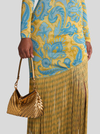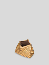 Iconic small Vela bag in metallic leather with distinctive woven detailing. This model can be carried by hand or on the shoulder thanks to the detachable and interchangeable strap and handle. This piece stands out for its distinctive metal closure and the medallion bearing the ETRO logo and Pegaso symbol engraved using the same technique used to mint coins. • Dimensions (Width, Height, Depth): 8.3 x 6.3 x 3.5 inches (21 x 16 x 9 cm) • Detachable shoulder strap • Metal feet • Golden-finish metal details • Made in Italy PRODUCT DETAILS • Exterior: calfskin • Lining: cowhide