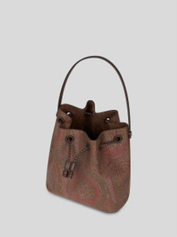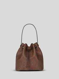Small bucket bag made from iconic Paisley jacquard fabric and embellished with matching-tone leather detailing. Perfect to carry on the shoulder or crossbody. • Dimensions (Width, Height, Depth): 9.4 x 9.4 x 5.5 inches (24 x 24 x 14 cm) • Adjustable shoulder strap, 21.7 inches (55 cm) long (drop) • Braided drawstring closure • Golden-finish metal details • Metal feet • Made in Italy PRODUCT DETAILS • Exterior: Paisley jacquard cotton fabric coated with matt texture and lined with canvas • Coating: 100% PVC • Trims: calfskin • Lining: cowhide